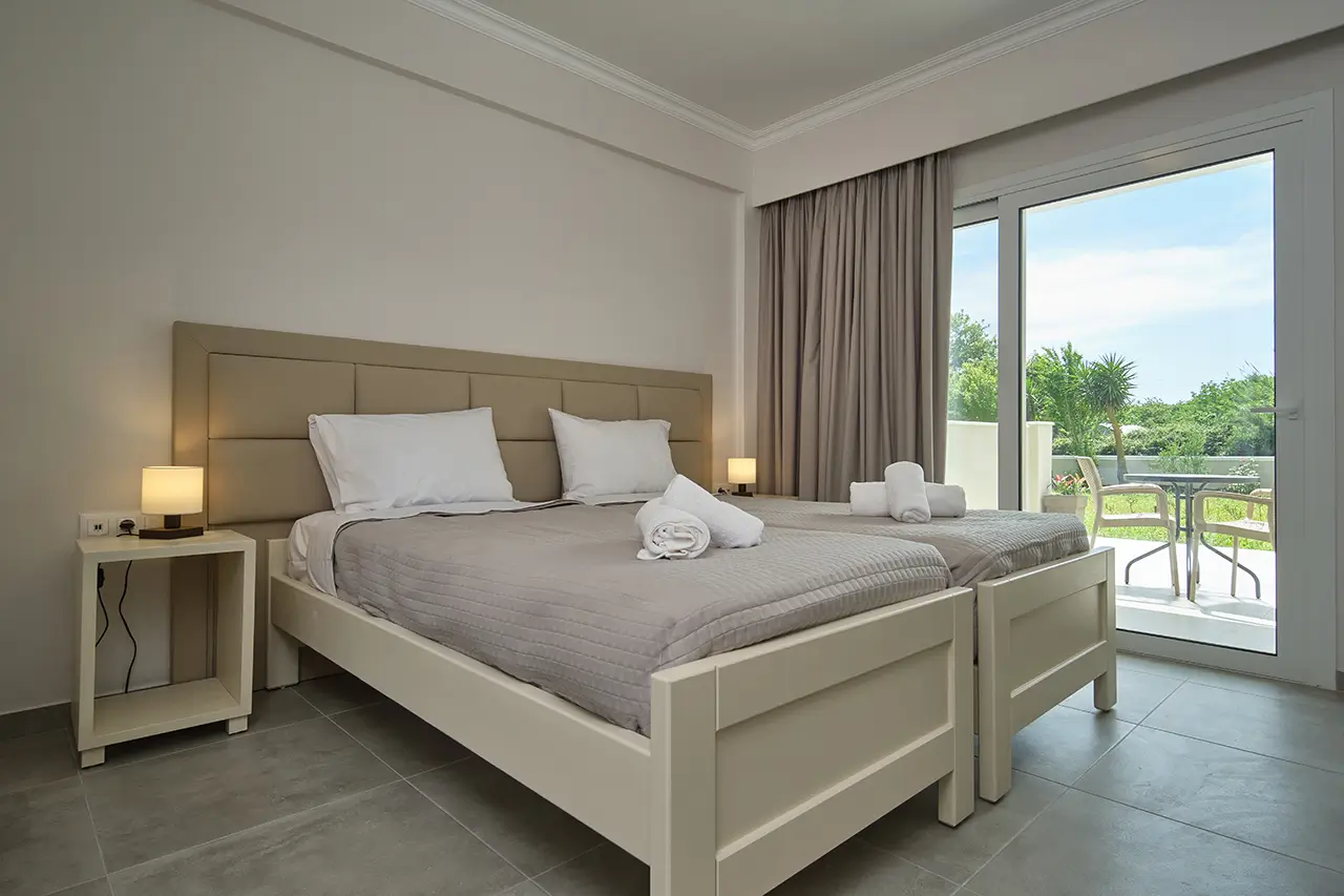 Ideal for couples or solo travelers, our Double or Twin Studios provide a cozy and inviting retreat. Each studio features comfortable bedding, a modern bathroom, a private balcony, and essential amenities for a relaxing and carefree stay in Sidari.