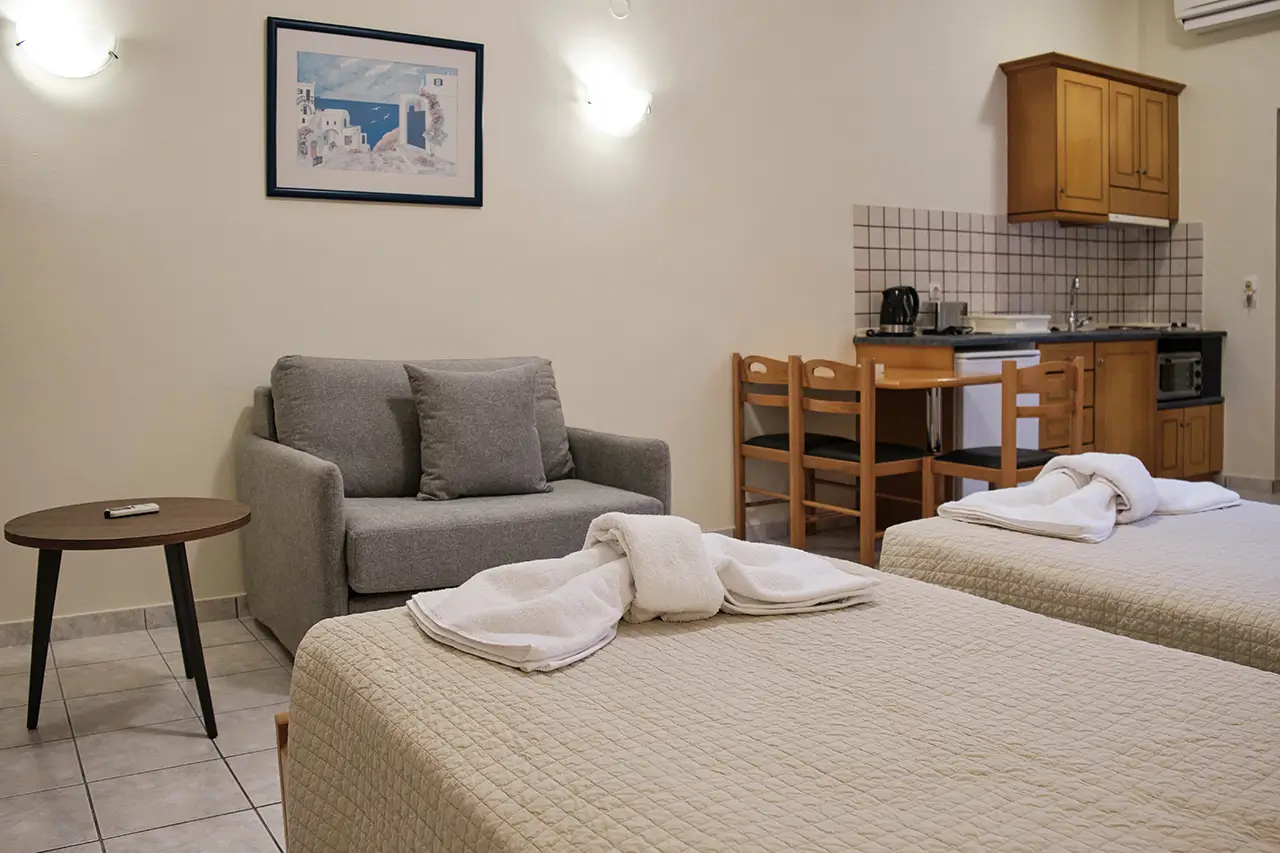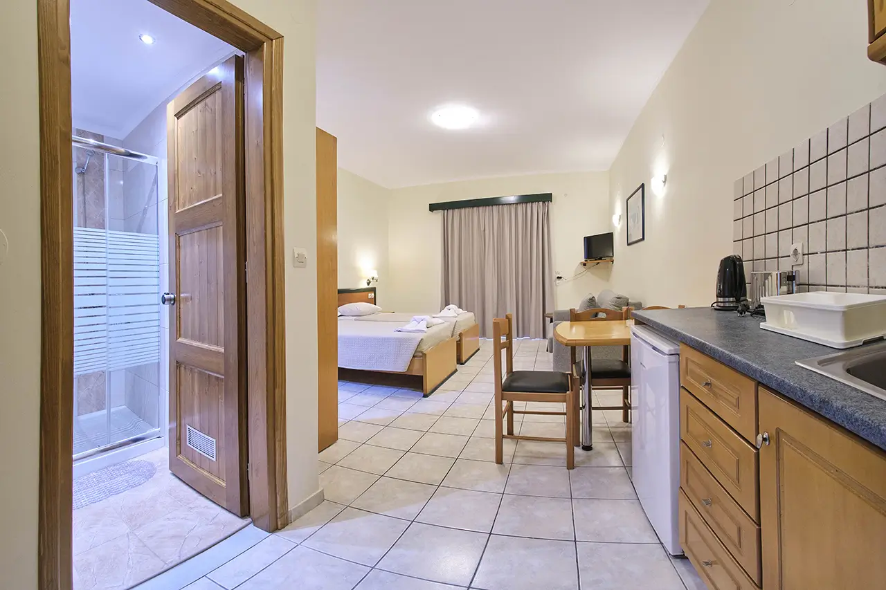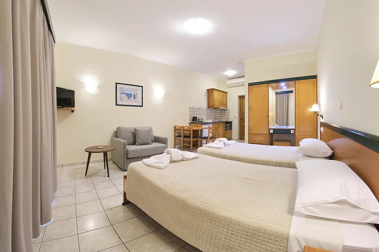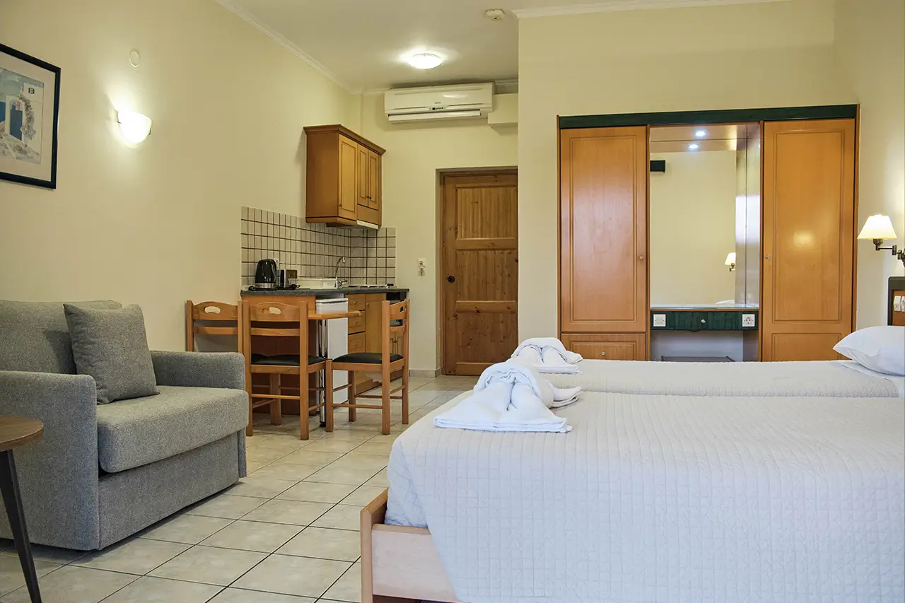 Our Double & Triple Studios are designed to offer both comfort and practicality, making them an excellent choice for small families or groups of friends. Bright, airy, and welcoming, each studio features cozy bedding and thoughtful amenities to ensure a restful holiday in Sidari.