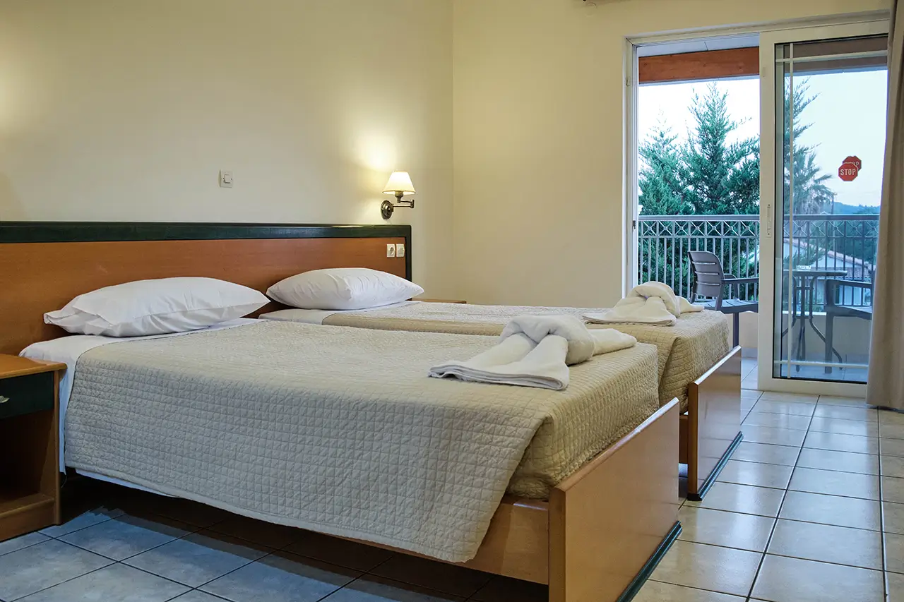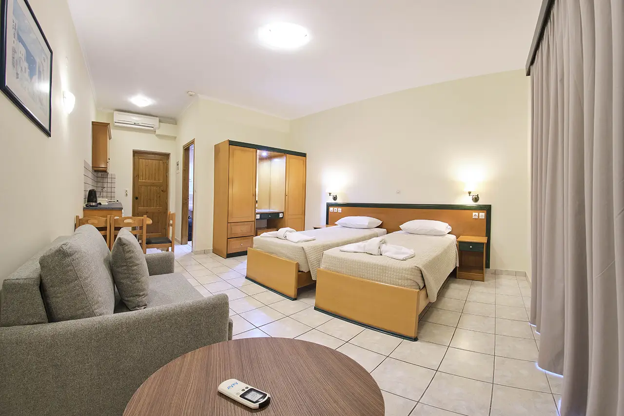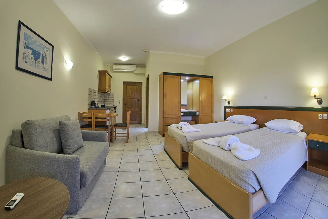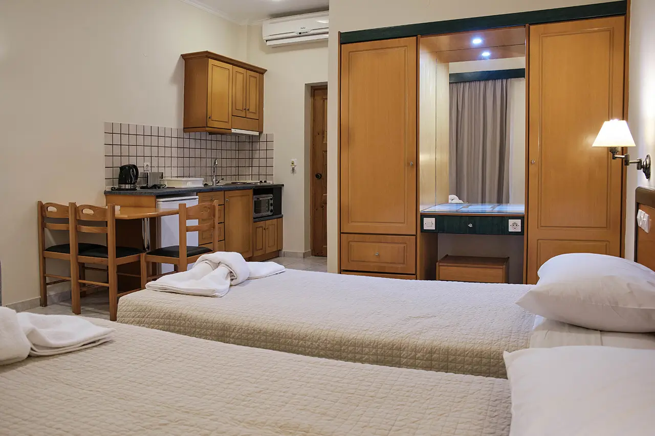 Our Double & Triple Studios are designed to offer both comfort and practicality, making them an excellent choice for small families or groups of friends. Bright, airy, and welcoming, each studio features cozy bedding and thoughtful amenities to ensure a restful holiday in Sidari.